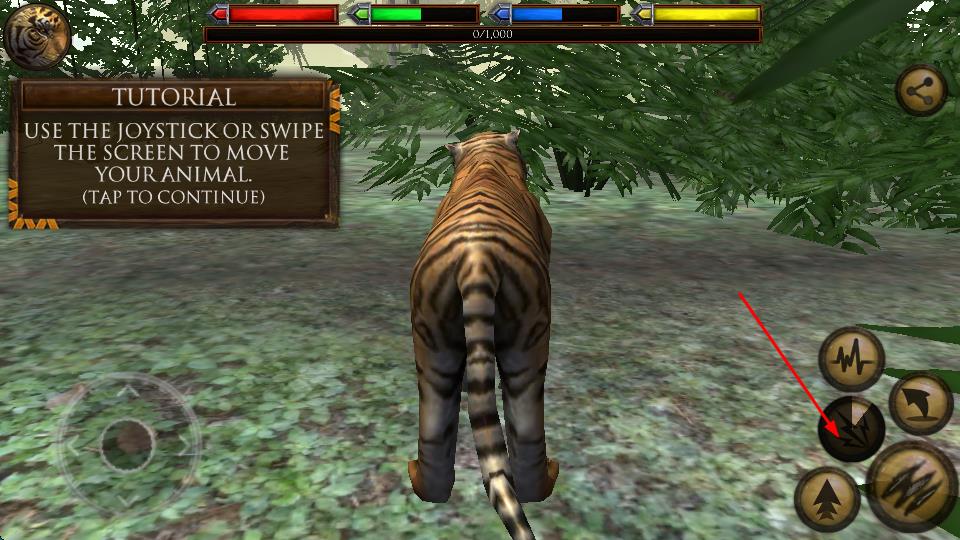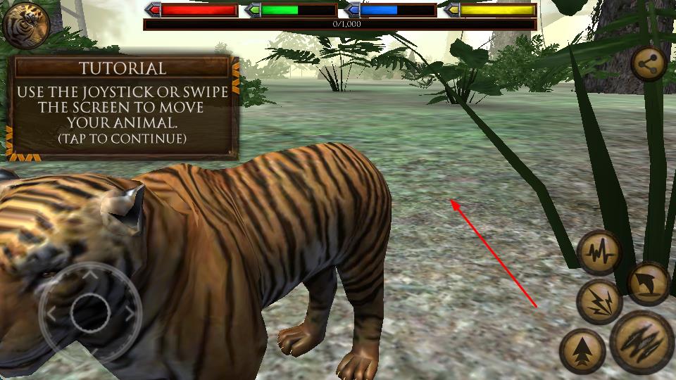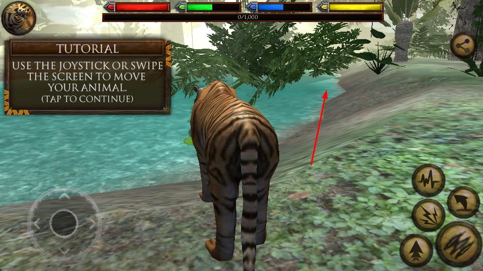 2、在丛林中自由活动,通过狩猎小型动物获取食物,寻找水源补充体力,与同类互动完成繁殖等生存任务。