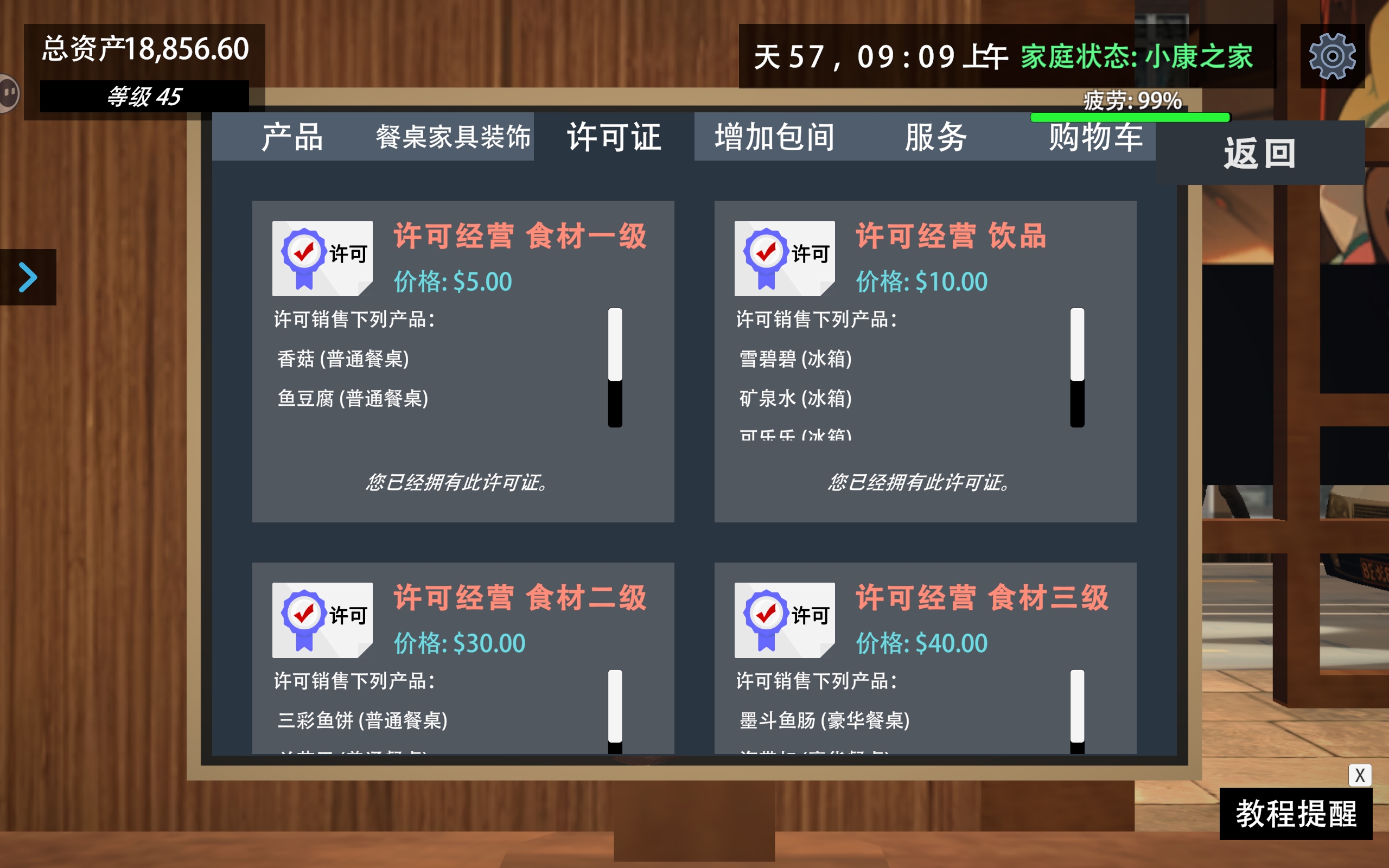 3、品类关联:许可与餐桌类型(普通/豪华)绑定,商品陈列受空间与许可双重限制,强化“资源→场景→销售”关联逻辑。