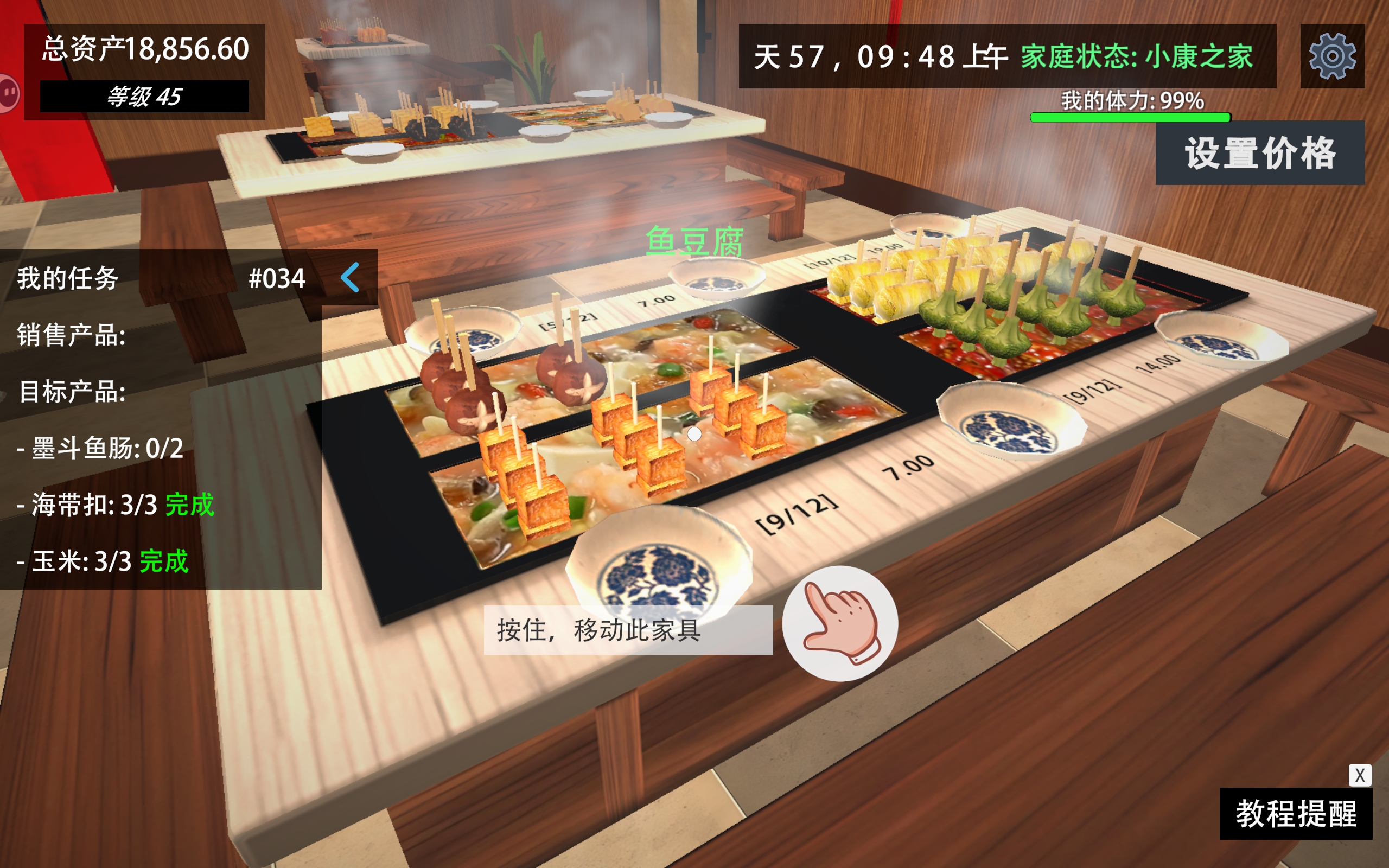 1、体力机制:体力(99%)影响操作效率(摆货、移动),形成“体力消耗→收益→恢复”节奏控制,避免无限制经营。