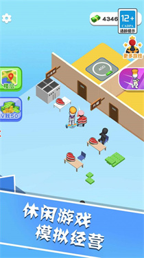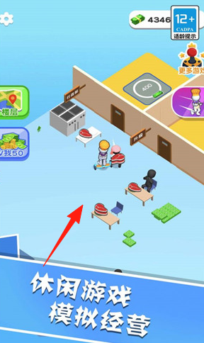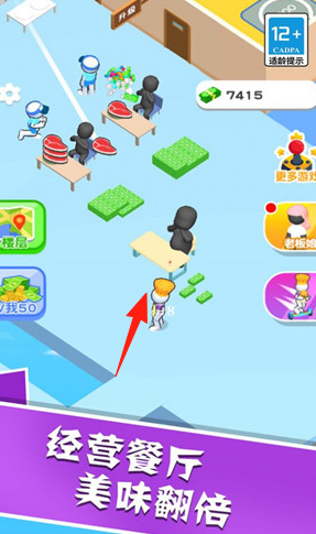3、拓展区域(红箭头),升级设施(桌椅炉灶),招募员工(服务员厨师),优化流程,扩大经营,解锁新菜品。