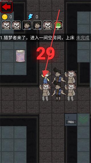 2、选“猎梦者模式”开局,用已解锁角色(如当前可用),进入游戏后,优先攻击玩家床铺,破坏防御。
