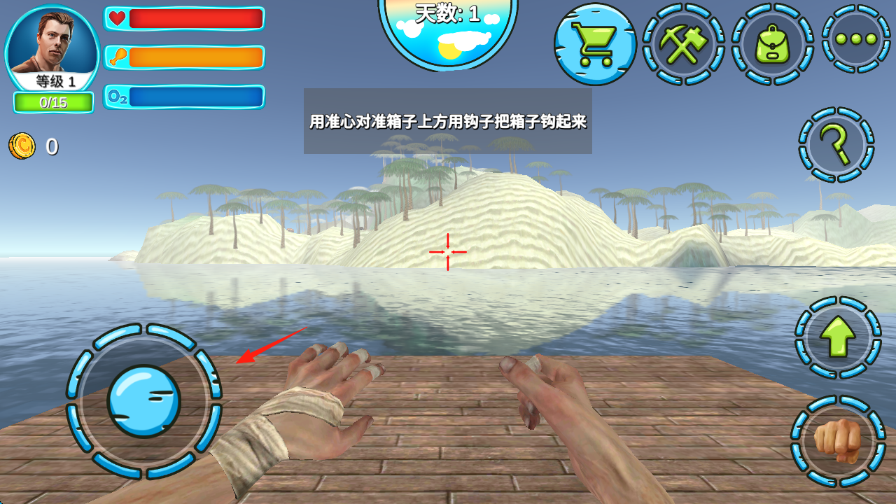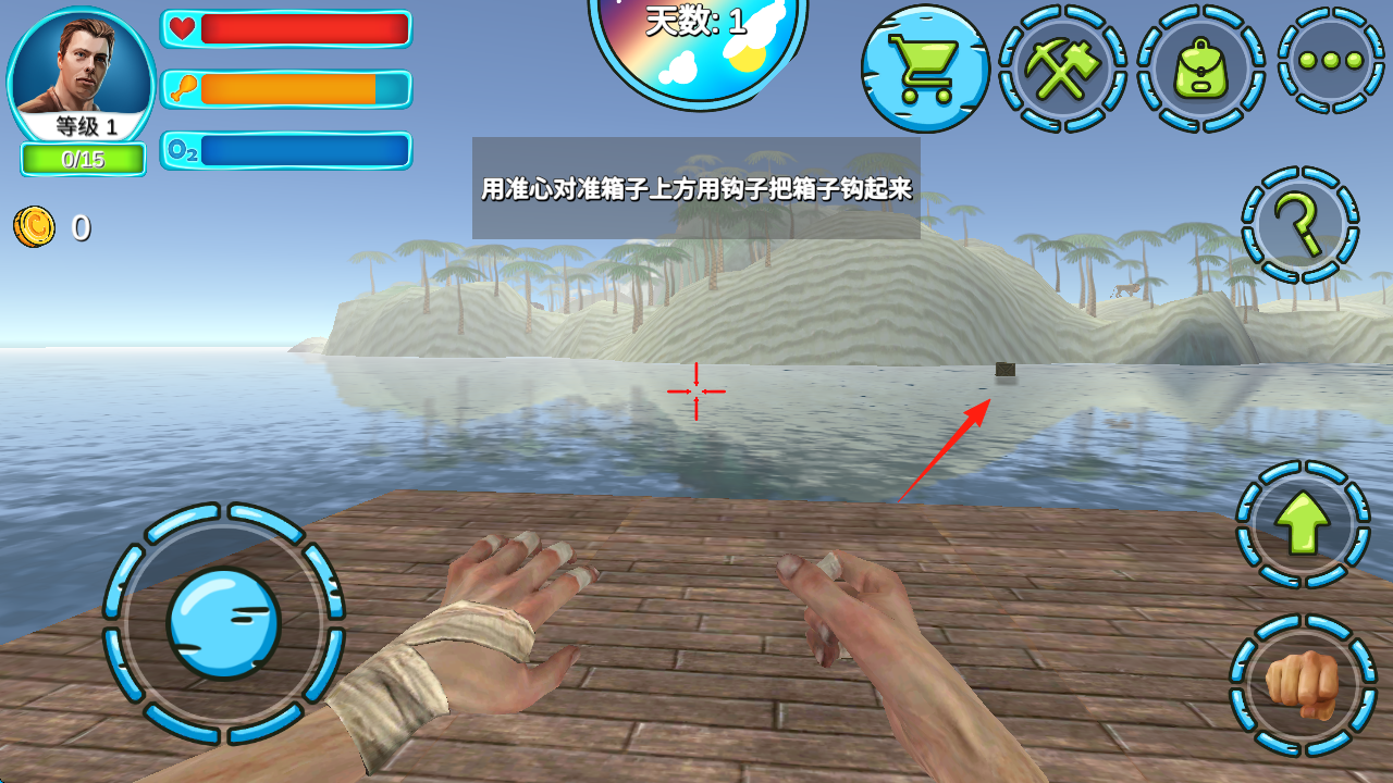 2、按提示(红箭头),用准心瞄准箱子,点击钩子按钮,钩取资源,收集物资(箱子→材料),提升生存能力。