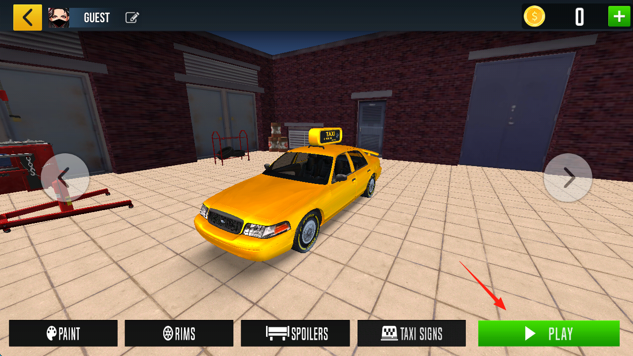 2、在车库界面(红箭头),选【PLAY】,出发接单,根据地图(街道建筑),规划路线,接送乘客,赚取金币。