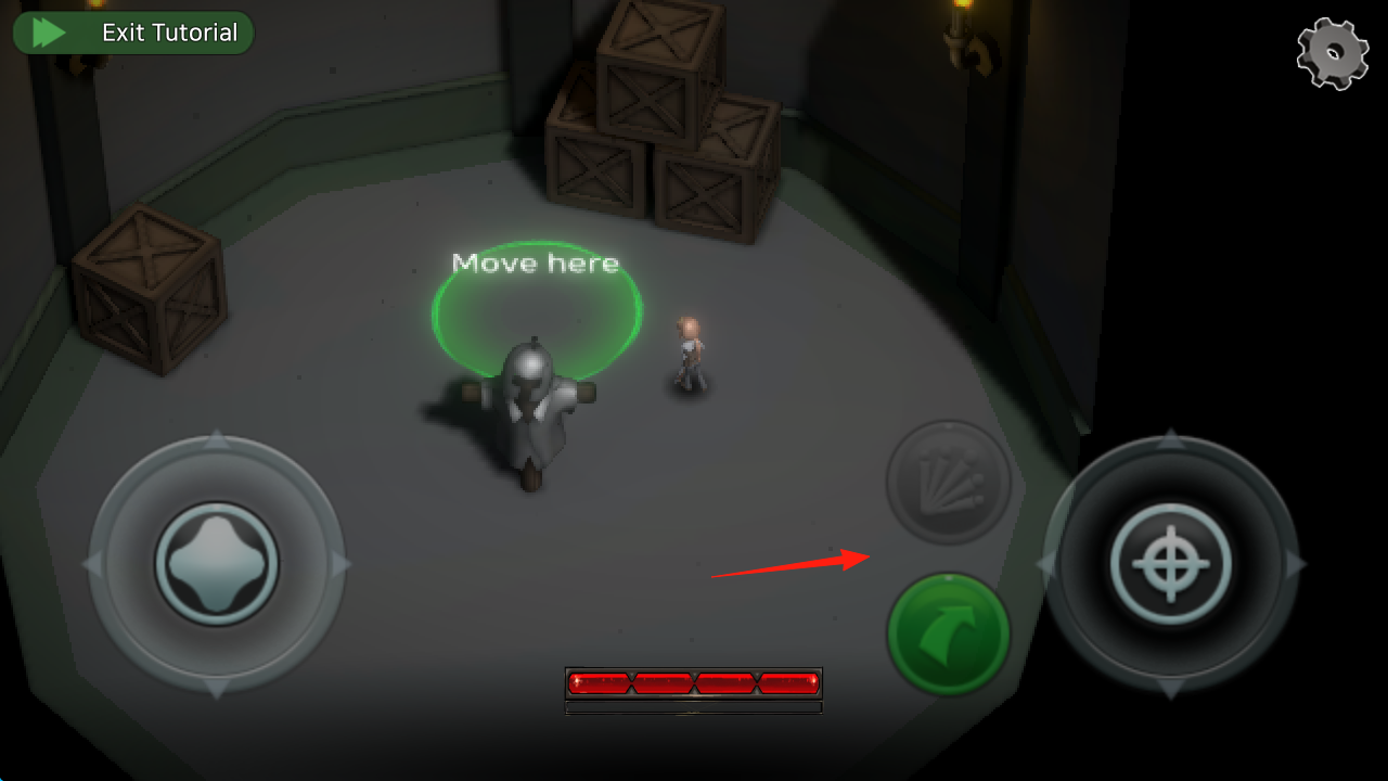 1、点击【NewGame】(红箭头),进入游戏,操控角色,用左下角摇杆(Move),移动至“Movehere”区域,完成教程。