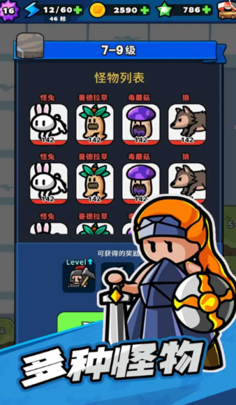 3、挑战7-9级关卡(红箭头),识别怪物(怪兔曼德拉草),用养成角色,搭配技能,击败怪物,获取奖励(武器材料)。