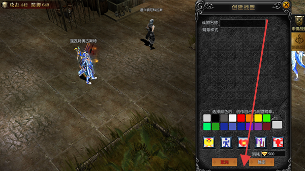 2、想创建战盟时,选“创建战盟”,填名称、图案,消耗500金币,选独特颜色、徽章,提升辨识度。