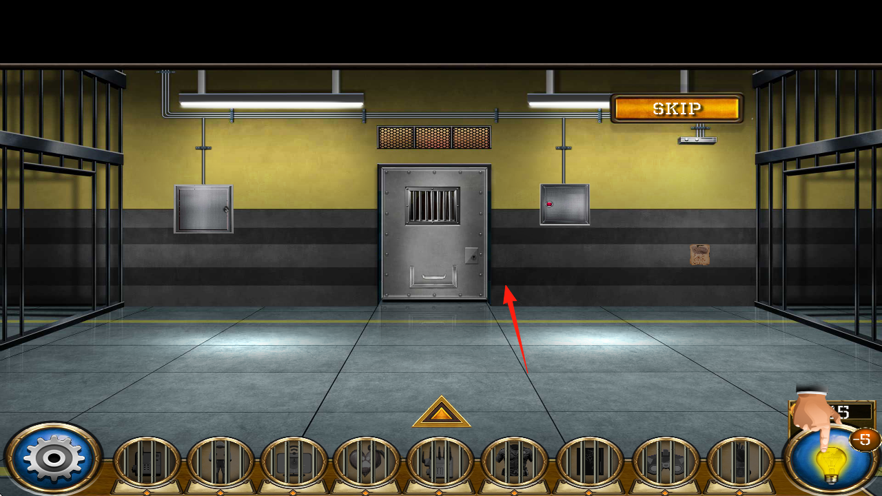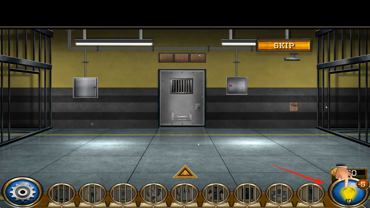 2、在牢房(红箭头),点击道具栏(灯泡),获取提示,用收集道具(钥匙工具),尝试打开铁门,推进流程。