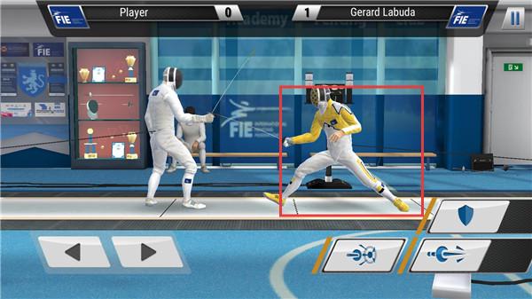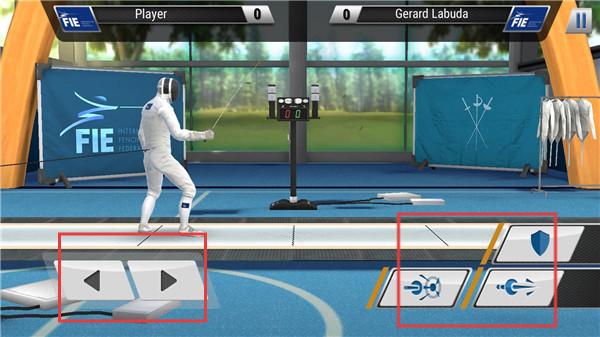 1、下载安装完成之后进入游戏,左侧箭头为控制运动员前后移动,右侧按键是弓步突刺、直刺和格挡等招式。