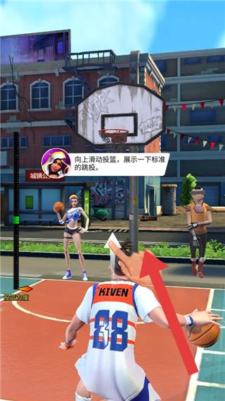 3、比赛时,按提示“向上滑动投篮”,操控角色“KIVEN”,完成标准跳投,得分,推进比赛进程。