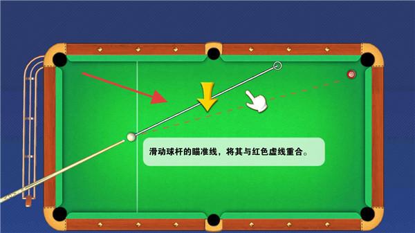 1、进入首先在开始挑战之前一起来熟悉下打球的操作,如下图所示:根据手势移动滑动球杆的瞄准线,将其与红色虚线重合。