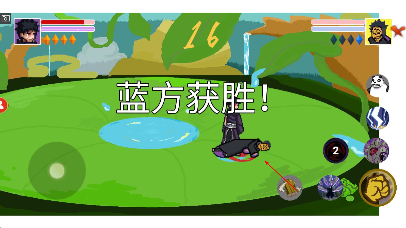3、进入战斗场景后,通过虚拟按键操控角色移动与攻击,当查克拉积攒至4格时,释放大招对敌人造成高额伤害,击败对手即可获胜。