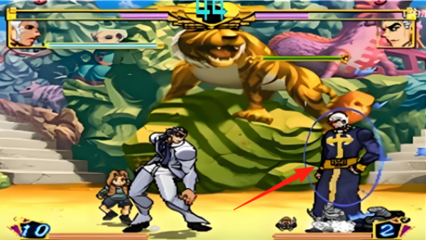 1、进入游戏在角色选择界面选中空条承太郎,装备白金之星替身,走进格斗场景准备首场对战。