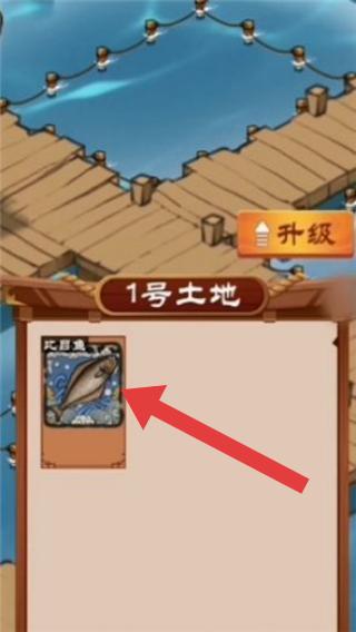 3、展示“1号土地”及“汇巨鱼”相关内容,还有“升级”功能按钮,玩家可在游戏中进行土地经营、鱼类养殖及设施升级等操作,体验水乡特色的模拟经营玩法。