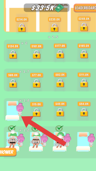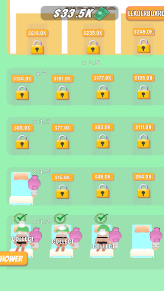 1、呈现水疗中心的床位、收益(如$33.5K)、可解锁项目(带锁标识及金额)等,玩家需经营水疗中心,解锁设施、赚取收益,属于休闲经营。