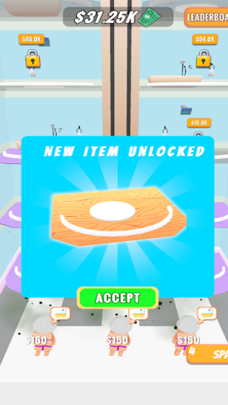 3、显示“NEWITEMUNLOCKED(新物品解锁)”弹窗,有收益($31.25K)等信息,玩家点击“ACCEPT(接受)”可确认解锁新物品,继续经营水疗中心。