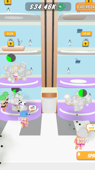 2、呈现水疗中心场景,有顾客(带金额标识,如$150)、设施(洗浴区等)、收益($34.46K),玩家需经营管理水疗中心,为顾客提供服务、升级设施以赚取收益。