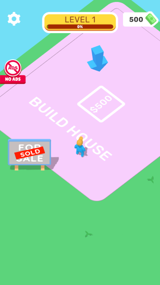 1、呈现“LEVEL1(第1关)”初始场景,有可建造房屋的土地(标有“BUILDHOUSE”)、已售土地标识(“FORSALE”变“SOLD”),玩家需在此关卡开展建房等经营操作。