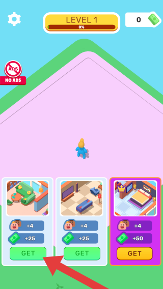2、显示可获取不同房间(如绿色按钮对应房间,有“+4”“+25”等增益),玩家通过点击“GET”按钮解锁房间,推进房屋建造经营进程。