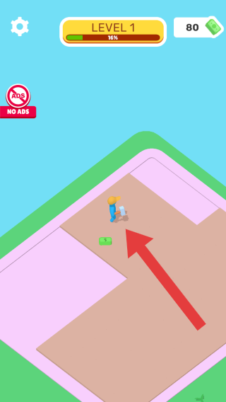 3、处于“LEVEL1(第1关)”,显示角色在地块作业,进度16%、货币80,玩家需操控角色进行房屋建造相关操作,推进关卡进度。