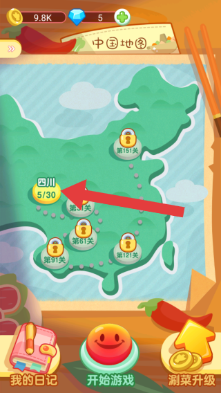2、呈现“中国地图”关卡选择,有“四川”等区域及对应关卡进度(如四川5/30),还有“我的日记”“开始游戏”“涮菜升级”等功能按钮,玩家可通过关卡经营火锅店。