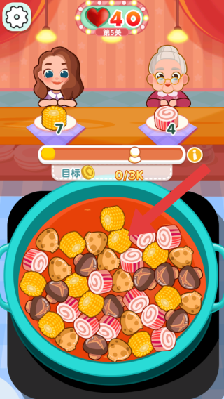 3、呈现第5关内容,有两位顾客及对应菜品需求(玉米7、肉卷4),火锅内有多种食材,目标是赚取3K金币,玩家需通过为顾客提供对应食材完成关卡。