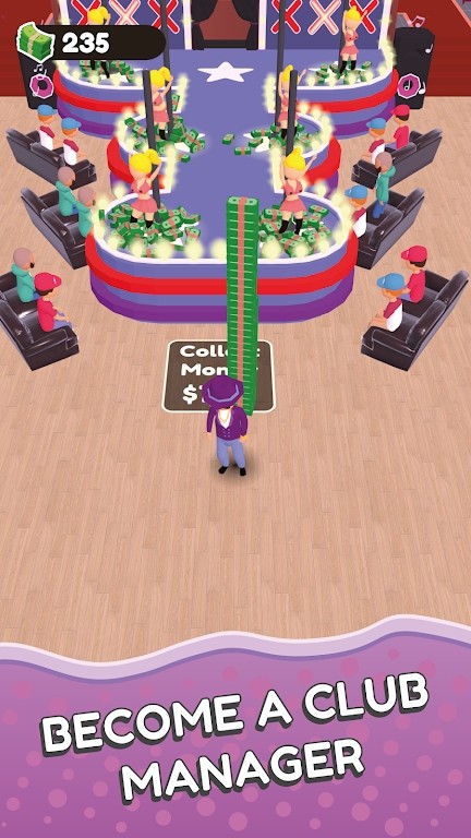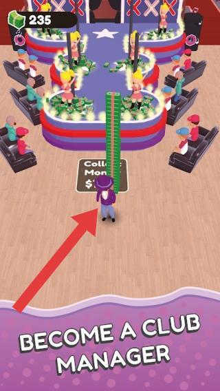 2、文字“BECOMEACLUBMANAGER(成为一名俱乐部经理)”体现玩法,玩家要像俱乐部经理一样,完成如引导角色“CollectMon(收集钱)”等经营、管理夜店的任务。