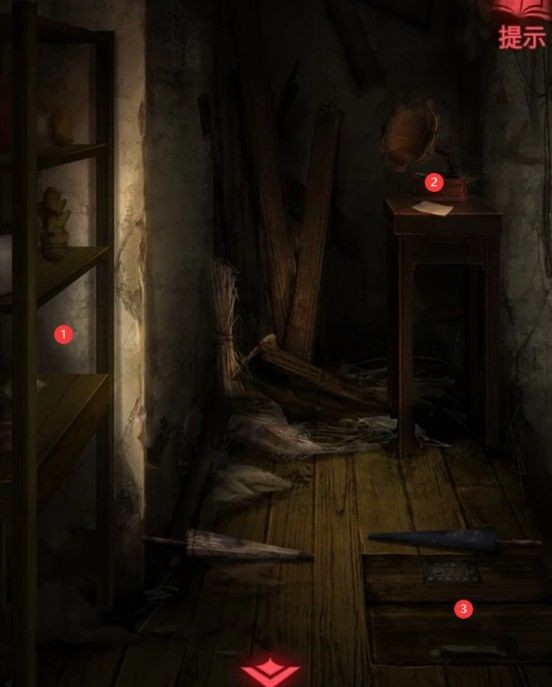 1、进入昏暗房间,优先调查标红数字【1】、【2】、【3】的区域,搜寻隐藏道具或线索,为后续解谜铺路。