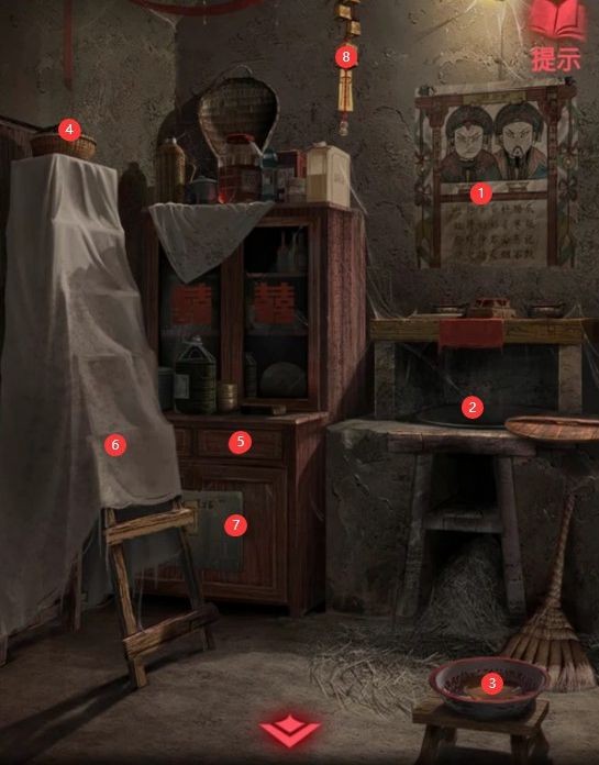 2、在古朴场景中,逐个查看标红数字【1】-【8】的区域,留意物品细节,收集关键线索以解锁机关。