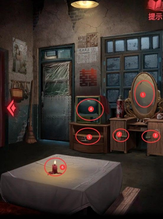 3、复古房间内,重点检查标红数字【1】-【6】的区域,关注镜子、电视等陈设,挖掘隐藏信息破解谜题。