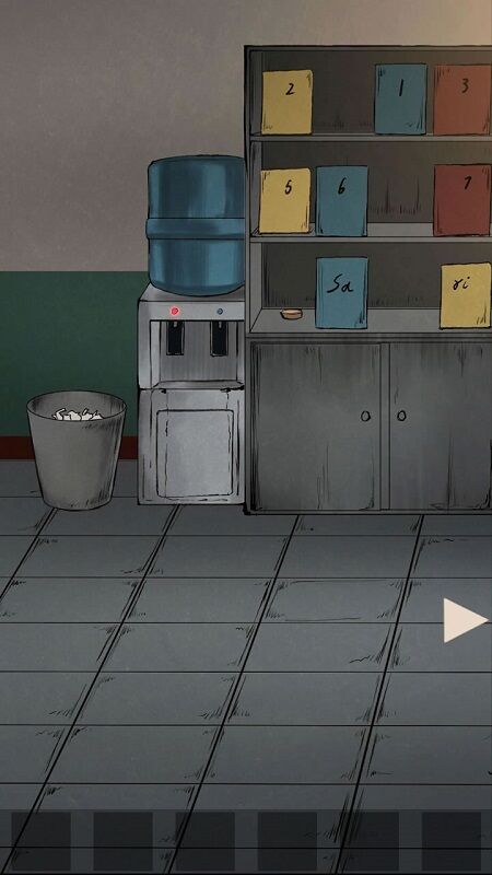物品收集:到房间左边拿走书架上的「水槽塞」、饮水机下面的「纸杯」和「螺丝刀」,翻找旁边的垃圾桶,将里面的碎纸条拼凑好,记住上面的图形密码「N」。