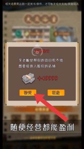 3、玩家可选择“接受”或“拒绝”投资,接受可获得+49999资金,属于游戏中商业合作、资本注入的经营玩法环节,通过此类决策推进店铺发展,提升盈利。