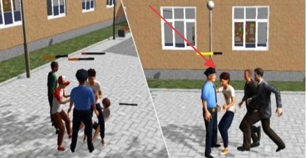 1、在街头场景,操控箭头指向的警察角色,介入两侧人群冲突,制止闹事行为,通过互动维持区域秩序,完成执法任务。