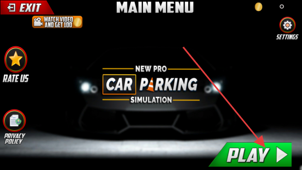 1、主菜单界面,找到右侧醒目的绿色【PLAY】按钮并点击,正式进入汽车停车模拟,开启停车挑战之旅。