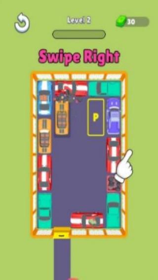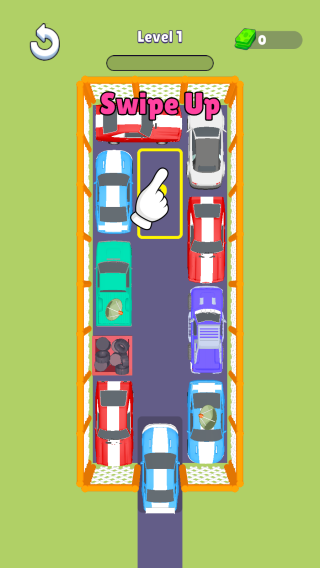 2、呈现第1关,提示“SwipeUp”(向上滑动)操作蓝色车辆,目标是通过滑动其他车,让特定车辆出库,是经典的空间推理移车玩法,考验玩家规划与操作。