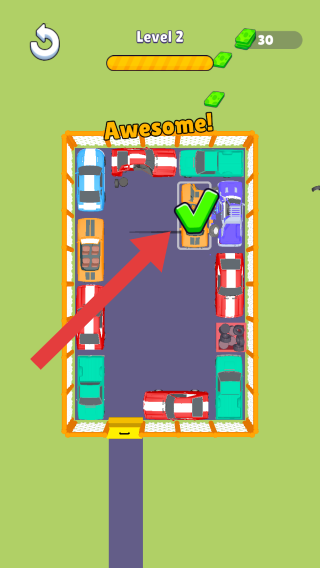 3、显示“Level2”,上方有货币、“Awesome!”,绿色对勾标识通关,玩家通过移动车辆腾出通道,让目标车辆成功离开停车场,是考验空间规划与逻辑推理的休闲益智玩法。