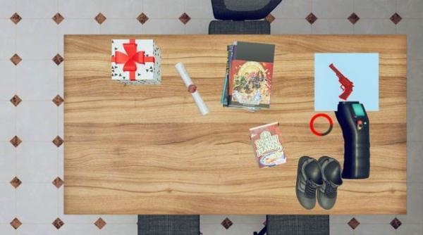 3、查看桌上物品,识别违禁品(如红色枪支),保留合规物品(书籍),处理违规物品,完成安检流程。