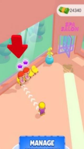 1、玩家扮演经营者,引导顾客、管理店铺、提供水疗服务来盈利,画面呈现等待服务的顾客、引导箭头及“MANAGE”操作按钮,通过满足顾客需求、升级设施等拓展业务。