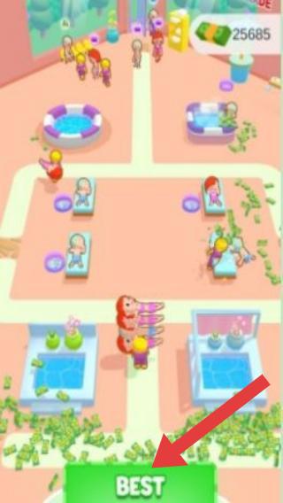 2、呈现店铺经营场景,有顾客享受水疗服务、散落的货币,底部“BEST”按钮用于评价或结算等,玩家通过合理管理服务流程、升级设施等,让水疗店高效运转盈利。