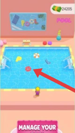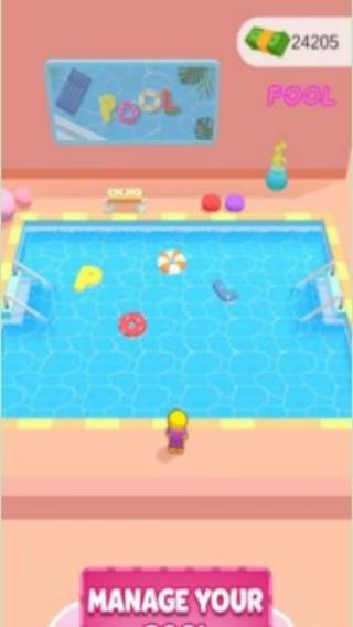 3、画面有泳池设施、漂浮物,上方显示货币,玩家需管理泳池等水疗区域,满足顾客需求、赚取收益,提示参与经营管理,通过优化服务、升级设施打造热门水疗店。