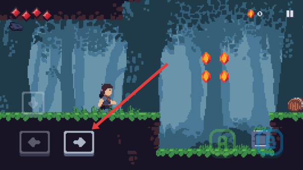 3、游戏中,点击箭头指向的右移按钮,控制角色在森林场景移动,收集火焰道具,推进关卡进度。