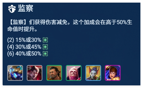 1、羁绊效果:“监察”羁绊按英雄数量触发梯度减伤:2英雄:生命>50%时,15%或30%伤害减免;4英雄:对应30%或45%减伤;6英雄:对应40%或50%减伤。