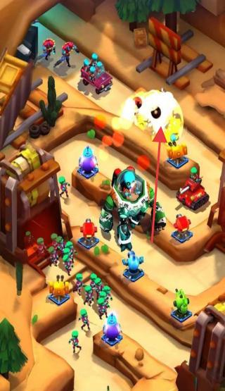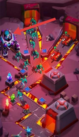 2、释放箭头指向的火焰技能,配合大型机甲与小兵,集火攻击敌方目标,同时保护己方建筑,稳固防线,提升输出效率。