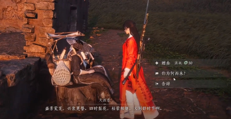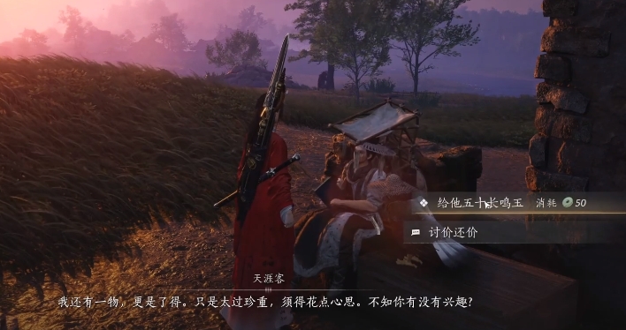 1、交互触发:探索开放世界,靠近“天涯客”(荒野残垣旁)→触发对话,查看交互选项(赠金、讨价还价、剧情提问)。