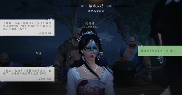 1、交互选项:与NPC对话分两类选择村落对话:在丰禾村和村民交流,选“话术回应”提升NPC“心值”(如宋金心值100、老宅杨心值70)。
