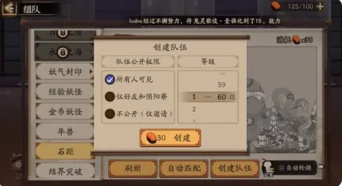 1、组队界面中,可设置【队伍公开权限】(所有人可见/仅好友等),选定等级范围后点击【创建】按钮组建队伍。