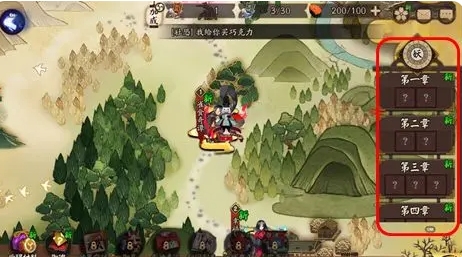 2、地图界面里,右侧红框标注【第一章】至【第四章】章节入口,点击对应章节开启主线剧情挑战。