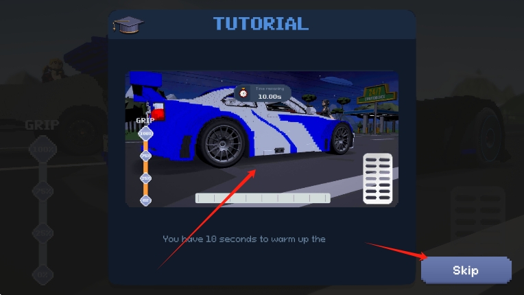 1、初入竞速之王,挑选首辆像素轿车驶入纽约街道,在新手引导下完成首次弯道漂移练习。