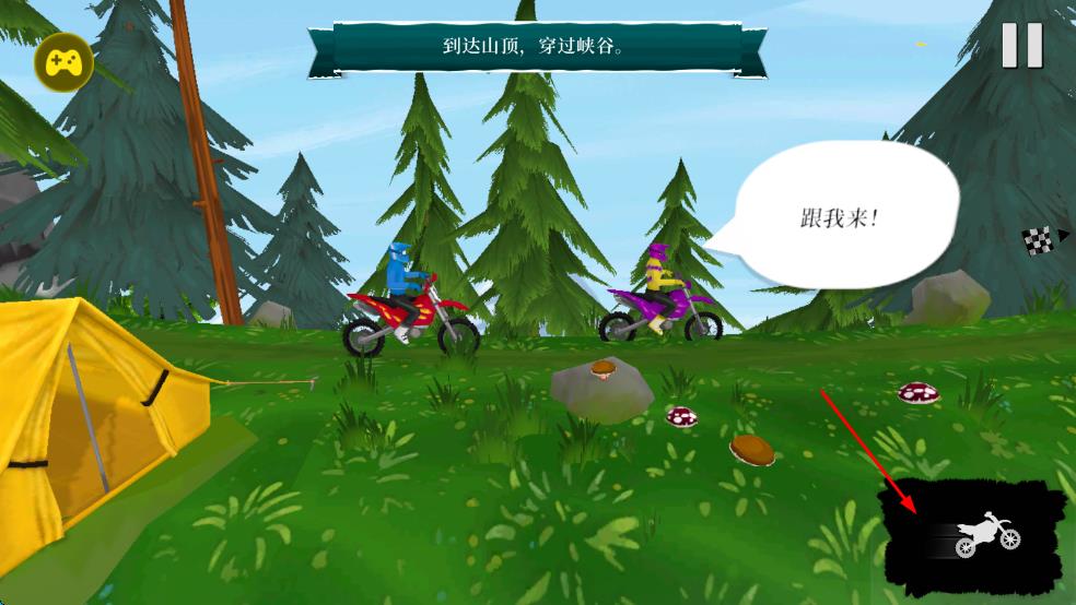 1、进入游戏后选择心仪的越野摩托,在起始点通过加速键让车辆疾驰,遇到前方坡道时迅速点击屏幕展开滑翔伞准备升空。