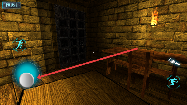 2、在密室,滑动左侧虚拟摇杆(箭头指向),控制角色移动,探索房间,寻找线索。