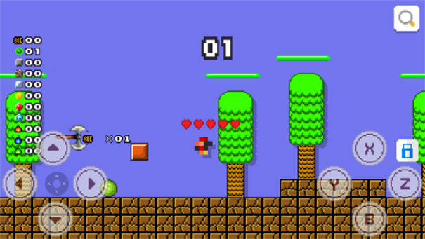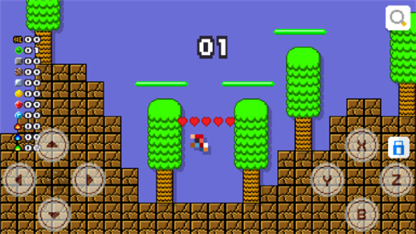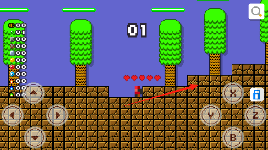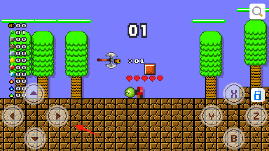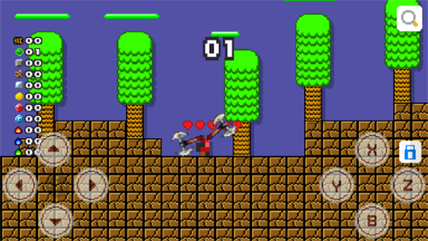 3、地形跨越遇到沟壑高地,操控方向键跳跃,借助地形(树木)辅助,通过障碍,推进关卡(01关)。
